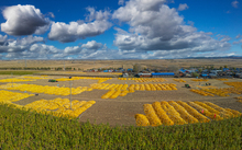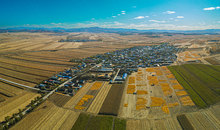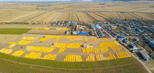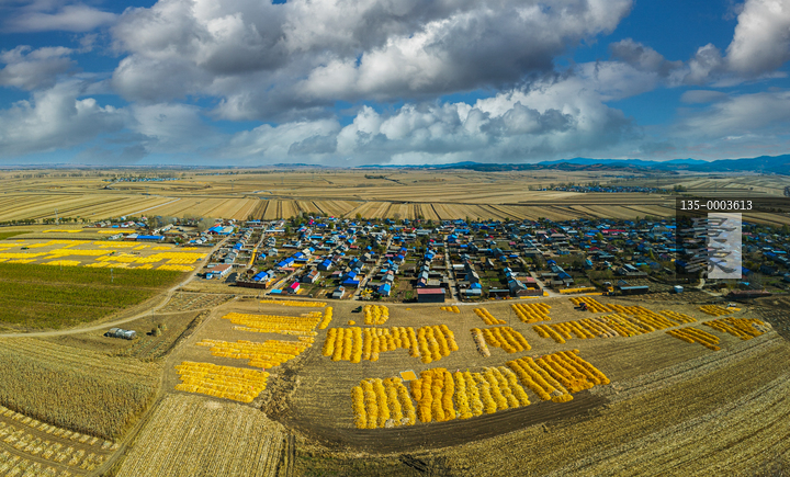 图片标题: 航拍玉米收成场院的大地村庄