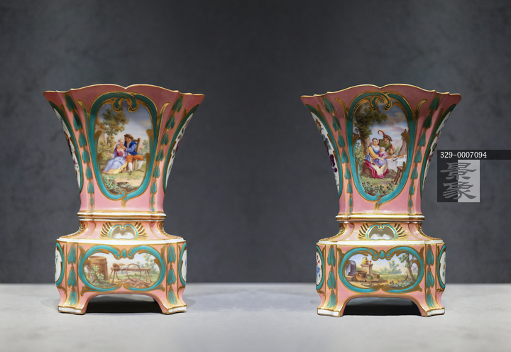 图片标题:     故宫-紫禁城与凡尔赛宫-17、18世纪的中法交往-粉地彩绘描金开光花卉人物图两节瓷瓶-1759年-法国塞非尔瓷器工场-故宫博物院藏