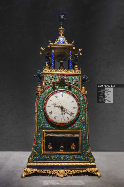 图片标题:     故宫-紫禁城与凡尔赛宫-17、18世纪的中法交往-铜镀金嵌珐琅亭式白猿献寿钟-清代-广州-故宫博物院藏