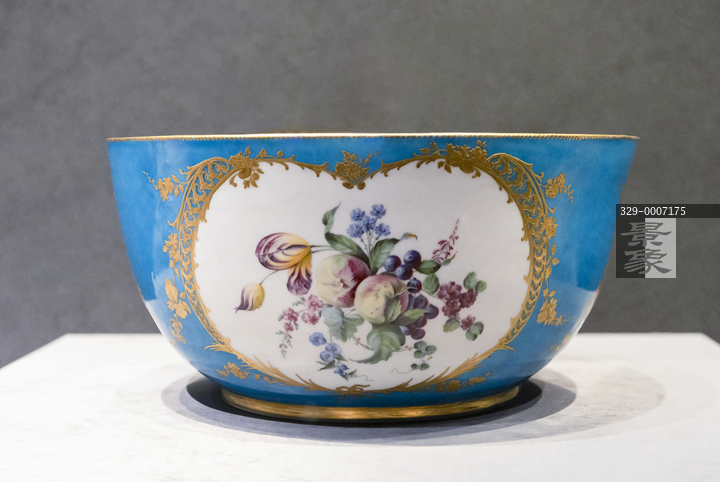 图片标题: 故宫-紫禁城与凡尔赛宫-17、18世纪的中法交往-天蓝地彩绘描金开光花果图潘趣碗-1753年-法国万塞讷瓷器工场-凡尔赛宫与特里亚农宫国家博物馆藏