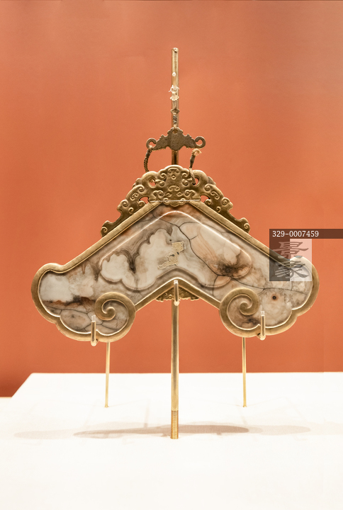 图片标题: 北京故宫汇流澄鉴-故宫出版社建社40周年展-仿玛瑙纹铜鎏金边瓷磬-清代