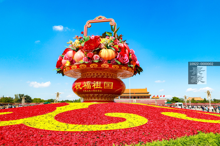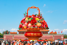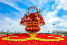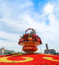 图片标题: 北京:国庆巨型花篮亮相天安门广场