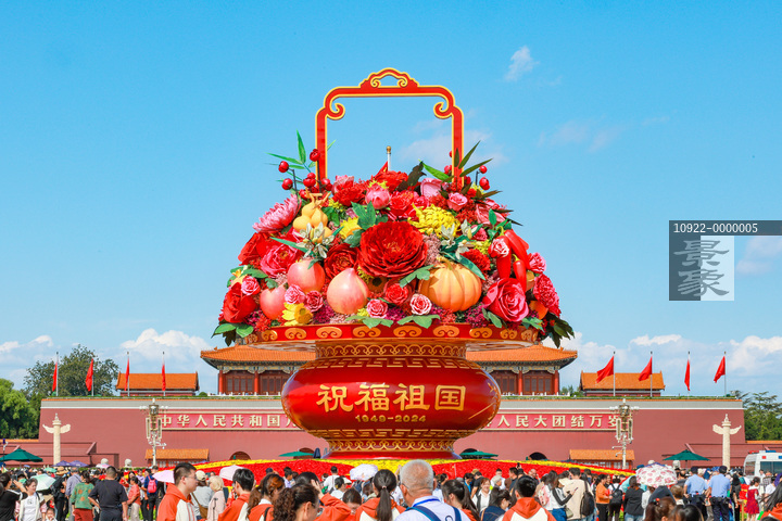 图片标题: 北京:国庆巨型花篮亮相天安门广场