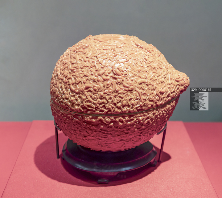 图片标题: 故宫珍宝馆-金胎珊瑚雕云龙福寿纹桃式盒-清雍正