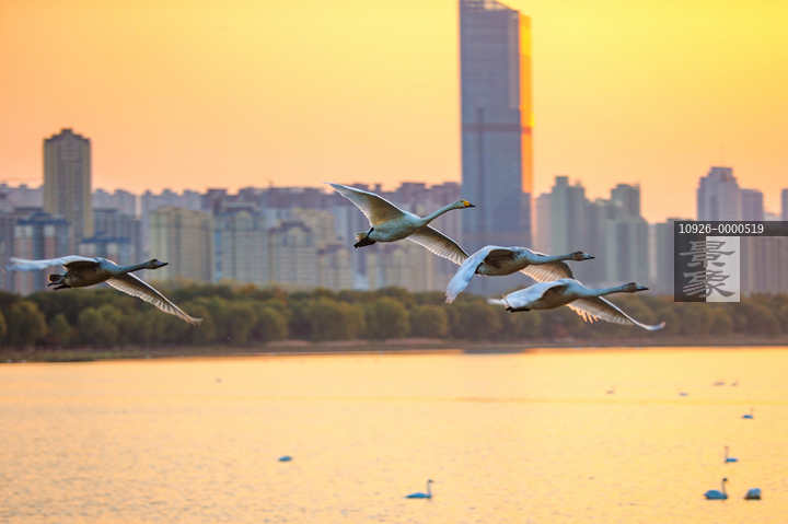 图片标题: 河南三门峡:天鹅舞朝阳 生态景如画