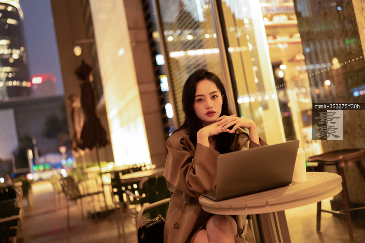 图片标题: 夜晚户外的青年女人使用笔记本电脑