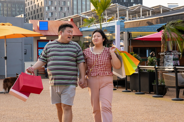 图片标题: 户外拎着购物袋的肥胖青年伴侣