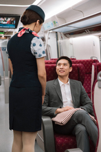 图片标题: 高铁车厢内坐在座位上透过窗户往外看的青年女人