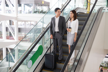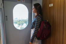 图片标题: 高铁车厢内坐在座位上工作的青年男人