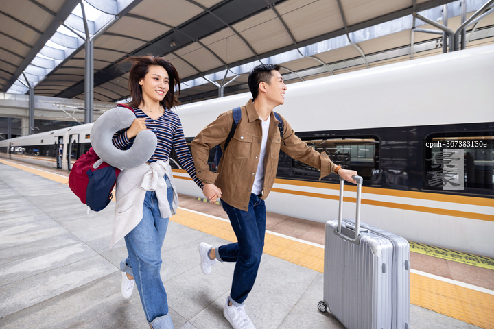 图片标题: 高铁站站台内拉着皮箱赶火车的青年情侣