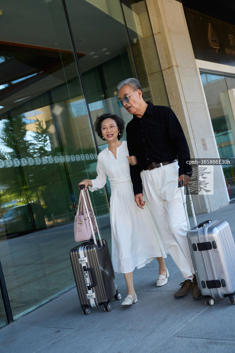 图片标题: 老年夫妇臂挽臂拉着皮箱走出酒店
