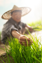 图片标题: 稻田里一位农民在进行水稻插秧