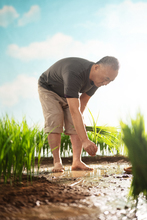图片标题: 稻田里农民夫妇在进行水稻插秧