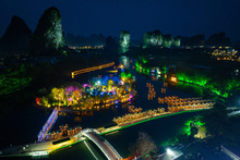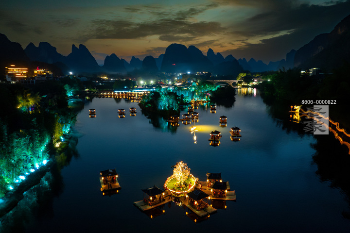 图片标题: 中国广西阳朔县游客坐竹筏夜游遇龙河