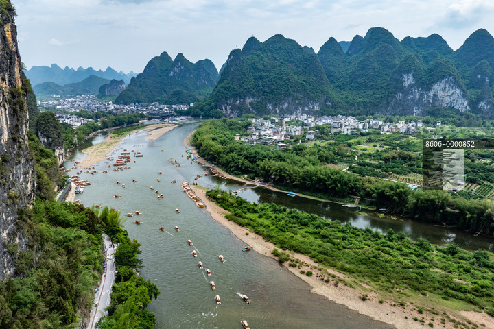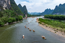 图片标题: 中国广西阳朔兴坪漓江精华段竹筏漂流引游客