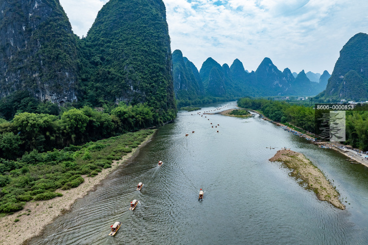 图片标题: 中国广西阳朔兴坪漓江精华段竹筏漂流引游客