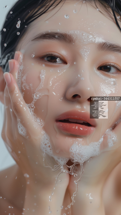 图片标题: 洁净肌肤的女孩在白色背景下洗脸,水珠飞溅,展现出清新自然的气息和愉悦的洗脸体验