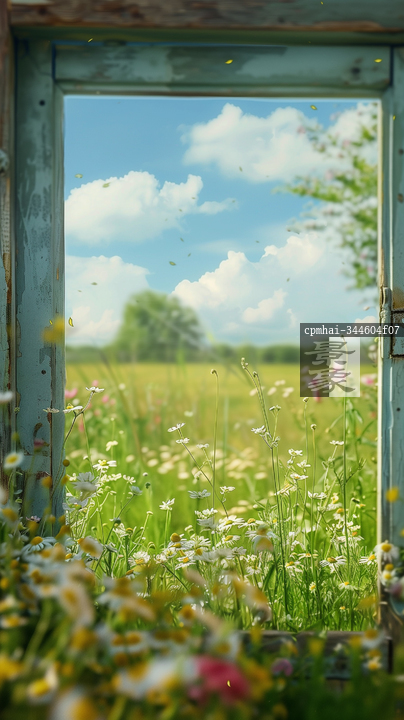 图片标题: 在花海中透视的玻璃门,映射出温暖的阳光