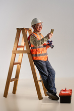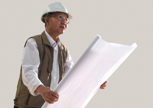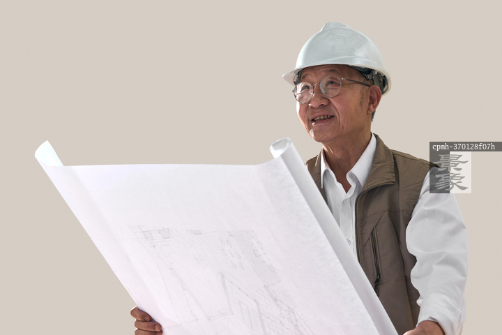 图片标题: 一名老年工程师研究施工图纸