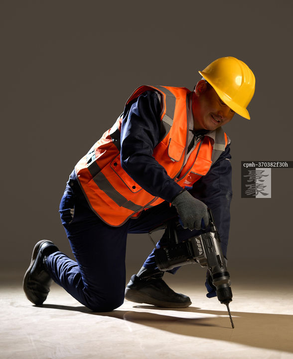 图片标题: 使用冲击钻的建筑工人