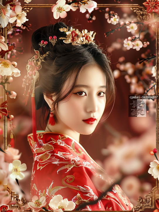 图片标题: 春季节日气氛浓厚的古典中式人物装饰画,展现了美丽的传统文化