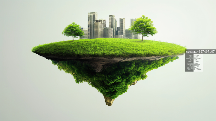图片标题:     绿色草坪漂浮岛与科技城市融合的未来景观