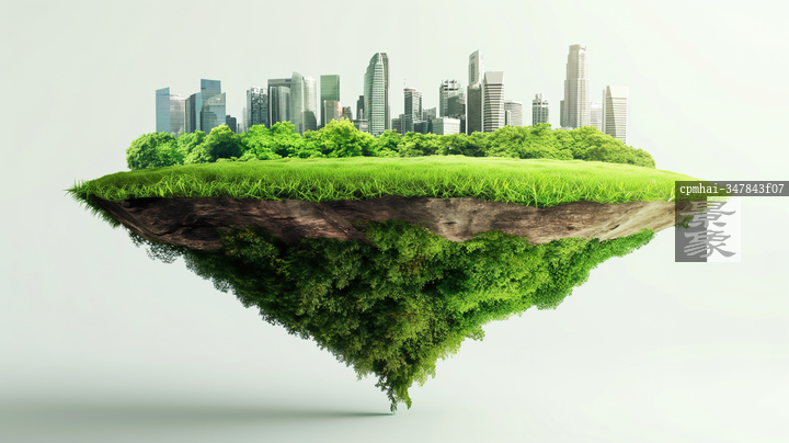 图片标题: 绿色草坪漂浮岛与科技城市融合的未来景观