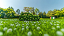 图片标题: 绿色草坪漂浮岛与科技城市融合的未来景观