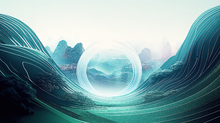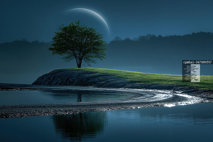 图片标题: 幽静湖面上的绿色浮岛与明亮平行线的奇妙景观