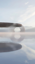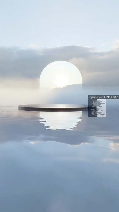 图片标题: 迷幻的倾斜抽象景观,周围水域环抱,极简风格白色空间的舞台设计