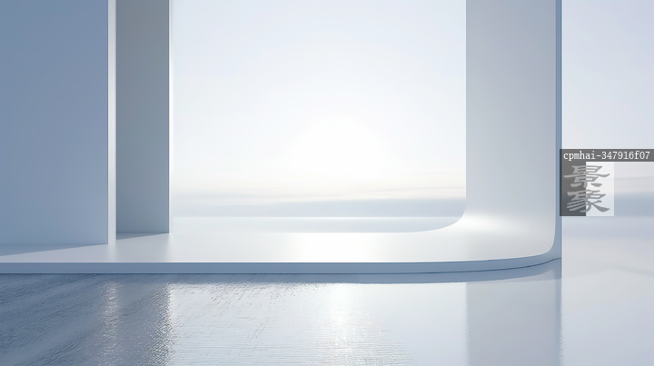 图片标题: 迷幻的倾斜抽象景观,周围水域环抱,极简风格白色空间的舞台设计