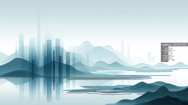 图片标题: 以极简风格呈现的青色山脉轮廓,融合现代与传统的中国山水画效果