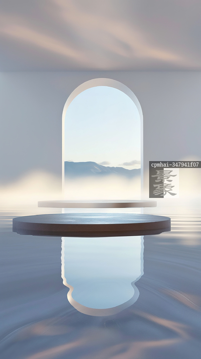 图片标题: 迷幻的倾斜抽象景观,周围水域环抱,极简风格白色空间的舞台设计