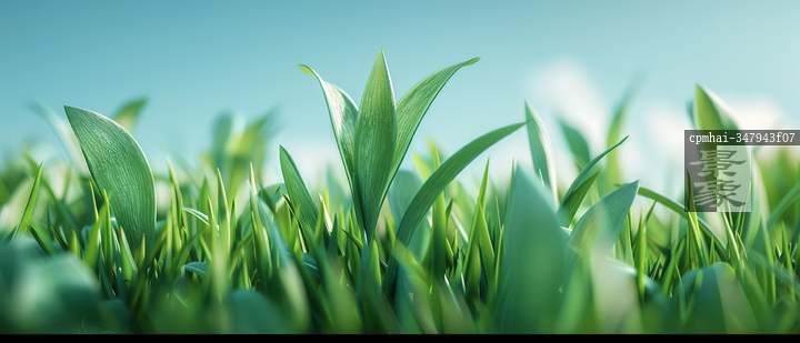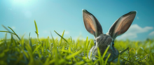 图片标题: 在阳光下的田野中,兔耳朵从翠绿的草地中冒出来