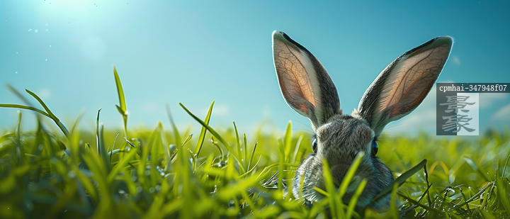 图片标题: 在阳光下的田野中,兔耳朵从翠绿的草地中冒出来
