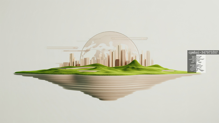 图片标题: 悬浮岛屿与和谐城市共存的绿色未来