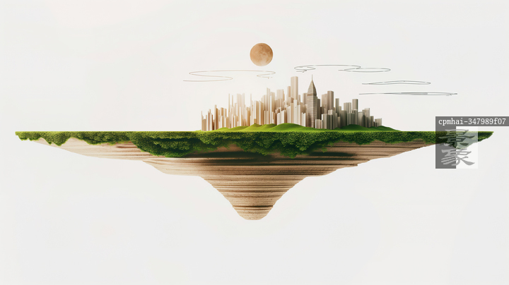 图片标题: 悬浮岛屿与和谐城市共存的绿色未来