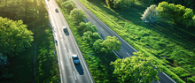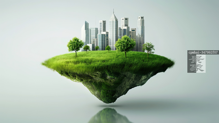 图片标题: 绿色草坪漂浮岛与科技城市融合的未来景观