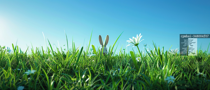 图片标题: 在阳光下的田野中,兔耳朵从翠绿的草地中冒出来