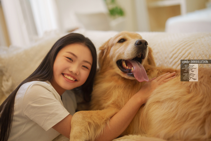 图片标题: 一位快乐女孩和宠物狗玩耍