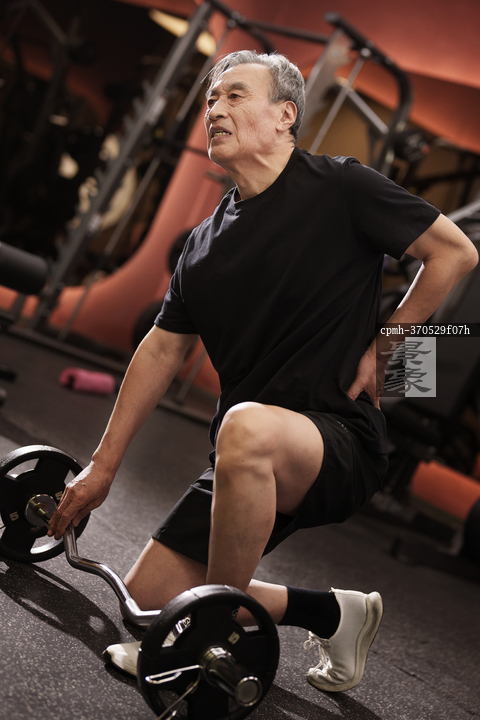 图片标题: 在健身房里锻炼的一位老年人腰部受伤
