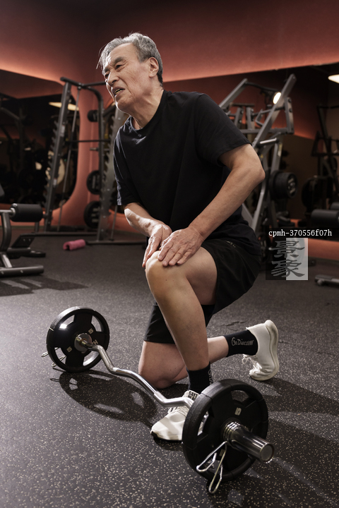 图片标题: 在健身房里锻炼的一位老年人腿部受伤