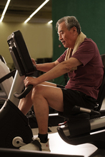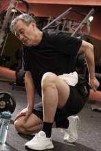 图片标题: 在健身房里锻炼的一位老年人腿部受伤