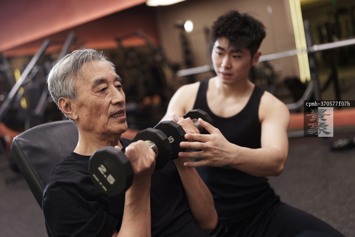 图片标题:     一位老年男性在健身房上私教课