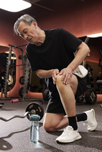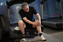 图片标题: 在健身房里锻炼的一位老年人腿部受伤