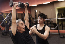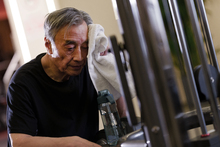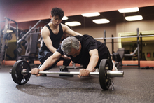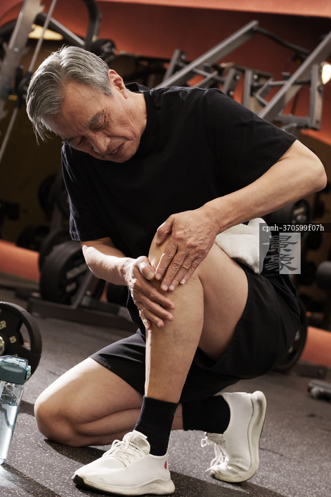 图片标题: 在健身房里锻炼的一位老年人腿部受伤