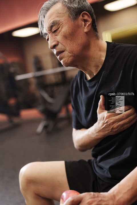 图片标题: 在健身房里锻炼的一位老年人身体不舒服