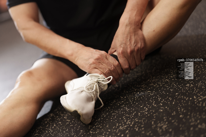图片标题: 在健身房里锻炼的一位老年人脚踝受伤