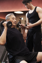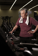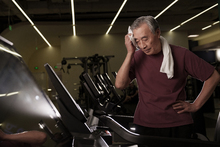 图片标题: 在健身房里锻炼的一位老年人腿部受伤