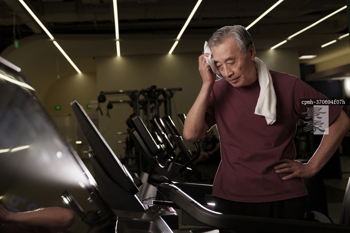 图片标题: 在健身房里锻炼的一位老年人身体不舒服